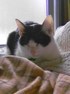 お腹減った……。そんなことはいいとして、写真はウチの猫が寝ているところを撮りました。よく見ると、薄目を開けてこちらを見ているんです(笑)彼女は朝から昼にかけての日差しがよく入る時間帯はここ、寝室にいます。万年床でよかったね~(笑)←笑い事か